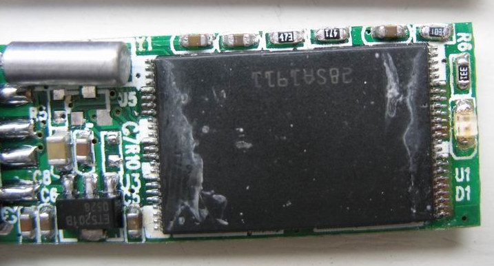 4、網上有資料說虛焊可能出現此類故障,我決定折開U盤看個究竟(死馬當作活馬到醫唄)。見不到螺絲,我就直接用刀撬,折開了(圖)U盤已經是祼體了,仔細瞧了瞧,沒見什么脫焊的地方(可能看不見吧),倒是看出來做工確實不敢恭維。